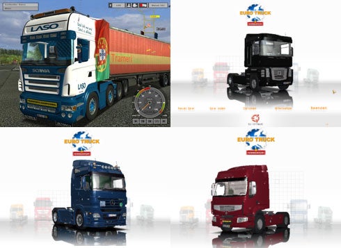 Turbine o Euro Truck Simulator com um Scania R580, um Mercedes Benz Actros, um Renault Premium 450 e um Renault Magnum 500.