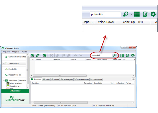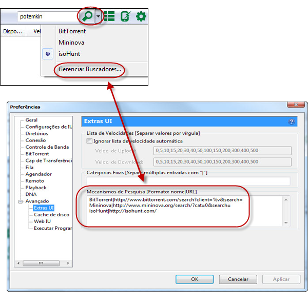 Agora que você já tem o uTorrent instalado, é só abri-lo e escrever o nome do material que você quer baixar no campo de busca do programa. O software o direcionará para um site de buscas genérico, mas é muito mais fácil configurar o uTorrent para que ele faça pesquisas apenas em sites especializados em torrents.Para isso, clique na lupa ao lado do campo de pesquisa, vá a “Gerenciar buscadores” e, na janela “Extras UI”, inclua o site escolhido para pesquisas de torrents na caixa com o título “Mecanismos de Pesquisa” (use o formato nome|URL, exemplo: isoHunt|http://isohunt.com/).