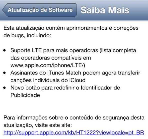 A Apple acaba de liberar a nova versão de seu sistema operacional móvel, o iOS 6.1. Entre as poucas novidades do sistema, a principal é a possibilidade de os assinantes do serviço iTunes Match poderem baixar canções de forma individual do iCloud.