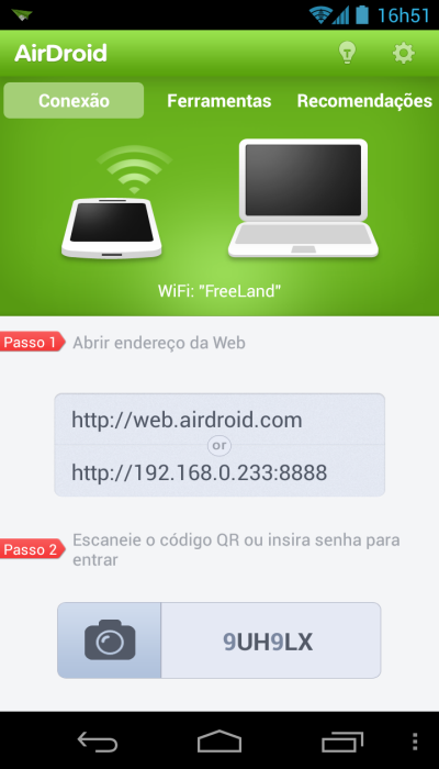 Ao abrir o AirDroid você verá esta tela, com as informações necessárias para conectar o PC ao celular sem cabos:
