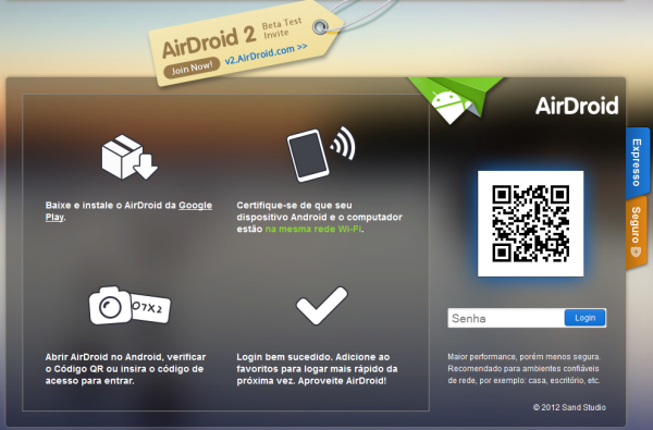 Abra qualquer navegador e entre um dos dois endereços mostrados na tela do AirDroid. Se você entrar o primeiro endereço (web.airdroid.com), verá um tela assim: