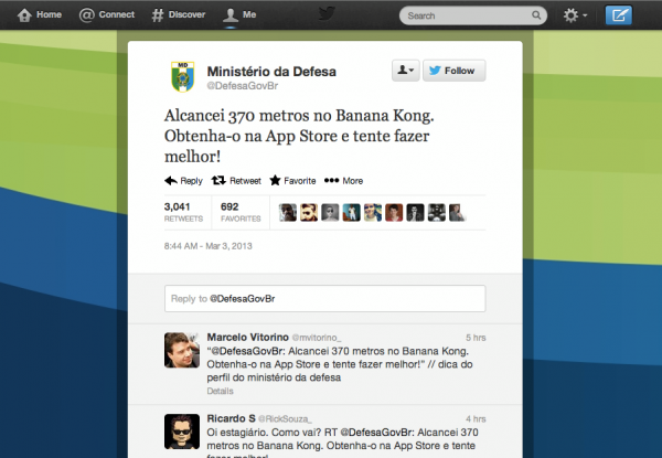 O Ministério da Defesa escorregou feio na casca de banana ao publicar no Twitter, no último domingo, o resultado alcançado em um jogo para iPhone: “Alcancei 370 metros no Banana Kong. Obtenha-o na App Store e tente fazer melhor!” Divulgado por engano, o post virou motivo de piada, está a caminho de se tornar o mais novo meme da internet brasileira e fez com que os downloads do game disparassem.