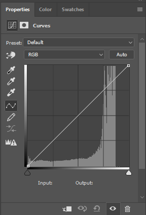 Você irá ver o painel de ajustes de Curvas: um gráfico com uma linha diagonal, subindo da esquerda para a direita. A parte inferior esquerda representa os pretos profundos e áreas de sombra de sua imagem. No topo direito estão as àreas com extrema iluminação. Entre elas está a totalidade de tons presentes em seu arquivo de foto.