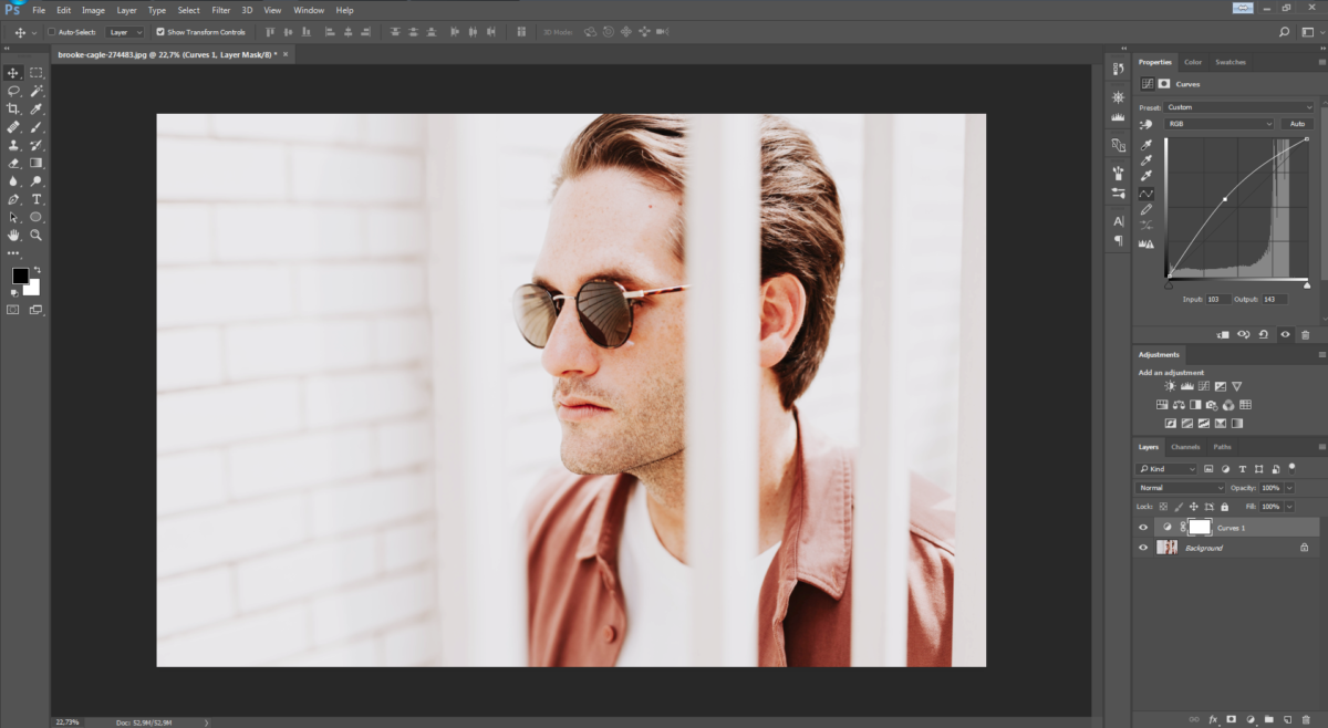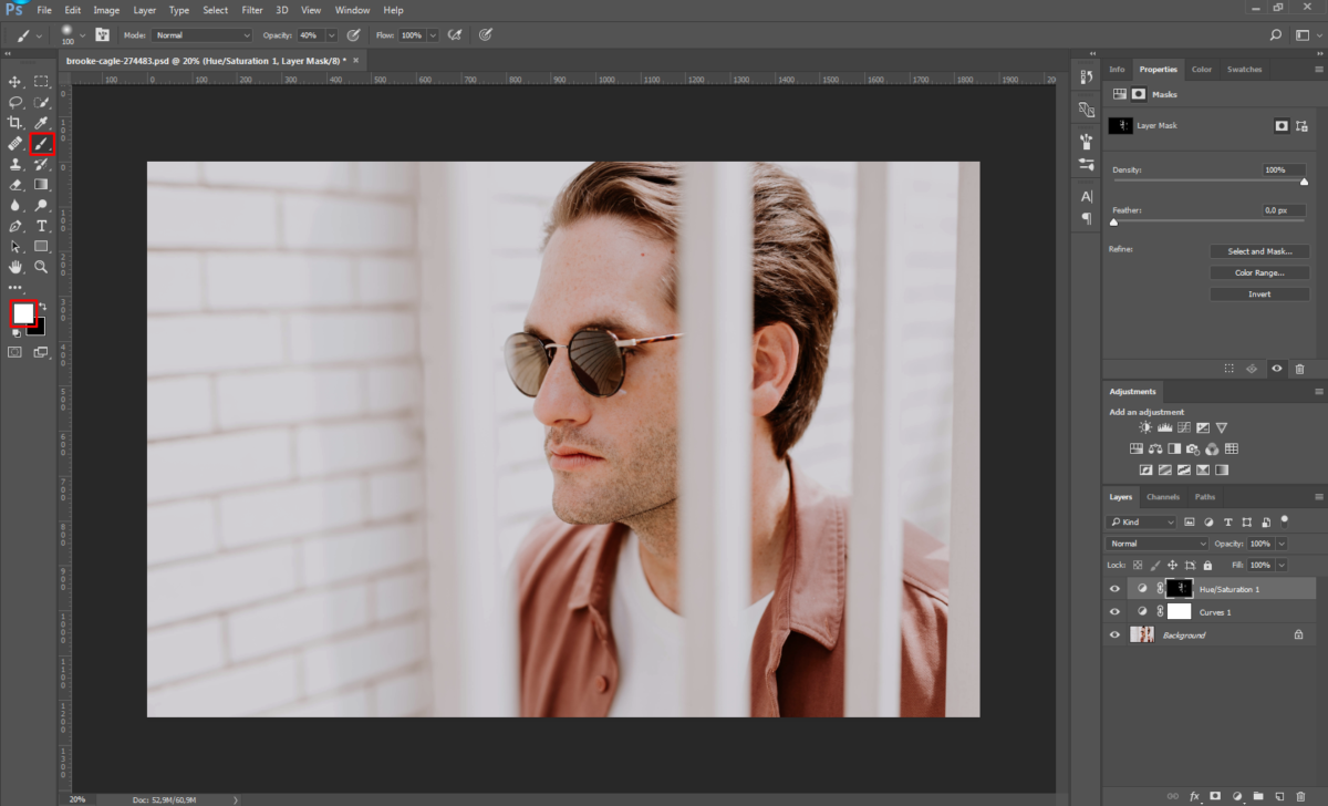 Por exemplo, na imagem acima, note como a estranha vermelhidão na pele do modelo na região de seu nariz, orelhas e olhos foi totalmente removida (sem alterar o tom de sua camisa ou outras áreas vermelhas) apagando a máscara sobre a dessaturação do Ajuste de Camadas apenas nessas regiões. Se for necessário, você pode voltar para o painel de ajustes e mudar o nível de dessaturação novamente até que as coisas pareçam completamente naturais. (Sejamos honestos: um nariz totalmente cinza não parece muito melhor do que um muito vermelho e brilhante.)