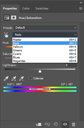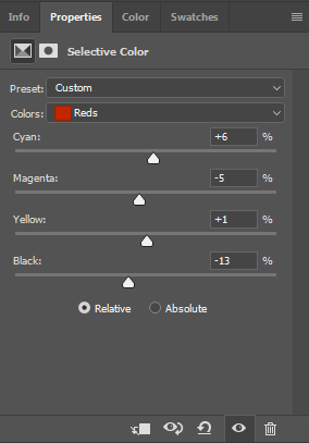 Você também pode ir para Camadas > Novo Ajuste de Camada > Selecionar Cor e alterar o tom preciso de vermelhos ou magentas dessa forma também (por exemplo, adicionando mais amarelos ou cyanos). Novamente, você então irá precisar mascarar todo Ajuste de Camadas com preto antes de pintá-lo novamente apenas onde você precisa usando o branco.