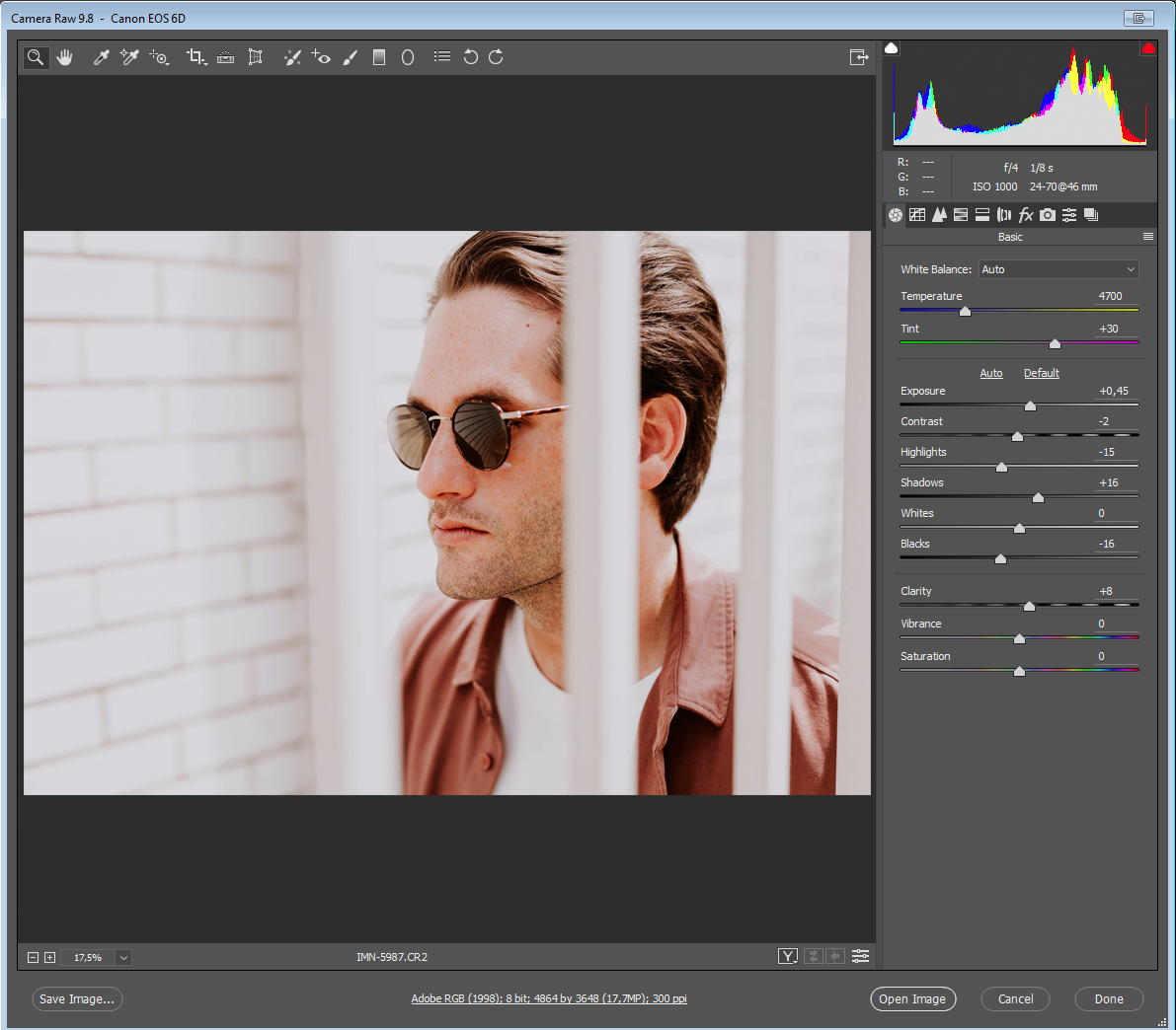 Melhor é manter todas as suas opções abertas processando seus arquivos RAW para a maior exposição de latitude possível e com uma configuração para uma cor relativamente neutra. Dessa forma, mesmo que você já tenha decidido que você irá para um estilo afiado e com uma vibe fotojornalística, toda a informação estará no arquivo no caso de você precisar dela.