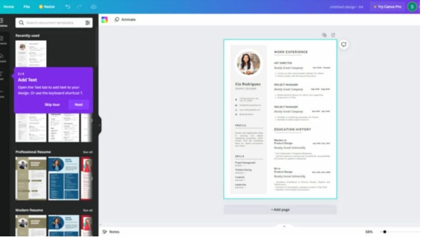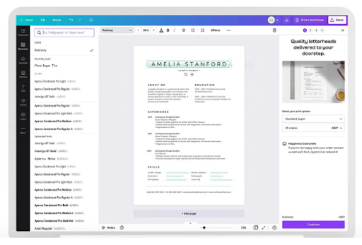 Você não precisa se contentar em usar os modelos do Canva como eles são. Há muitas funcionalidades no programa para editar rapidamente qualquer um dos estilos de esboço. É uma abordagem muito melhor do que criar um currículo do zero e passar horas se perguntando quais cores e elementos de design usar.