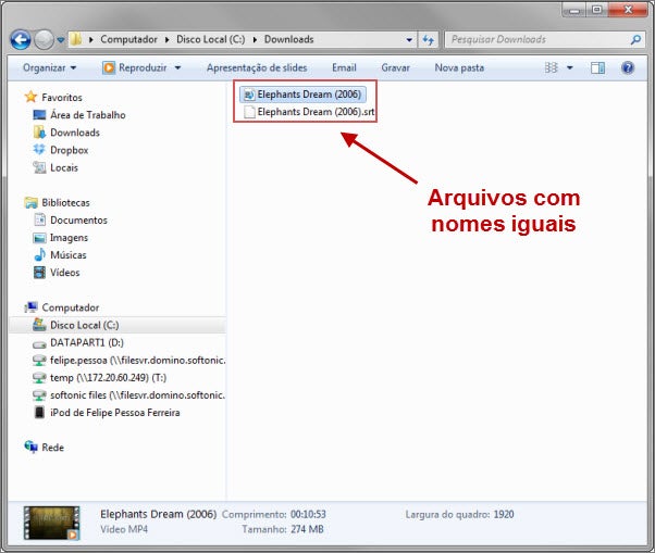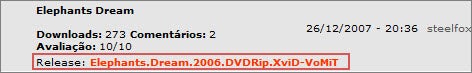 Selecione o arquivo da legenda e espere que ela apareça na tela. Mas, não se esqueça: o arquivo da legenda deve ser sincronizado para o Release do arquivo de vídeo. Release? O que é isso? Quando você faz uma busca por um arquivo de legenda, percebe que o nome do arquivo é complexo, com alguns caracteres um pouco sem sentido, como na imagem abaixo: