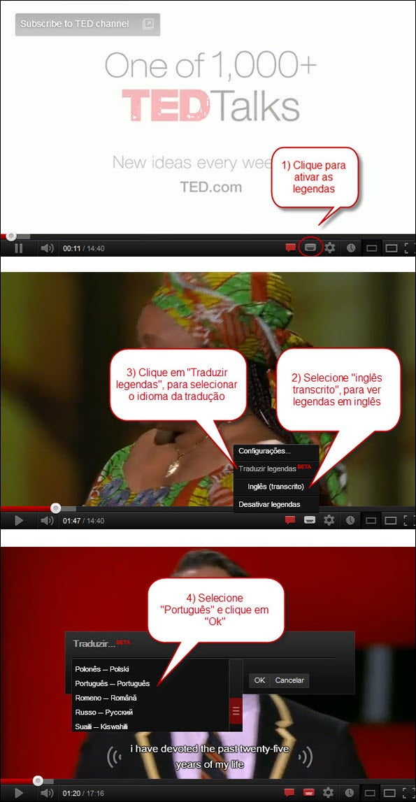 Quando for ver algo no YouTube, ative as legendas em inglês mesmo, para acompanhar o que ouve, com o texto na tela. Se estiver começando e preferir ver as legendas em português, confira o passo a passo a seguir (há vídeos que não contam com o recurso):