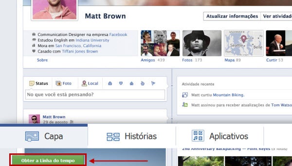 2. O Facebook criou uma página especial, com explicações detalhadas de todas as funções da Linha do Tempo. Esta página tem uma barra inferior com as opções “Capa”, “Histórias” e “Aplicativos. Também há um botão verde que exibe “Obter a Linha do Tempo”. É nele que você deve clicar: