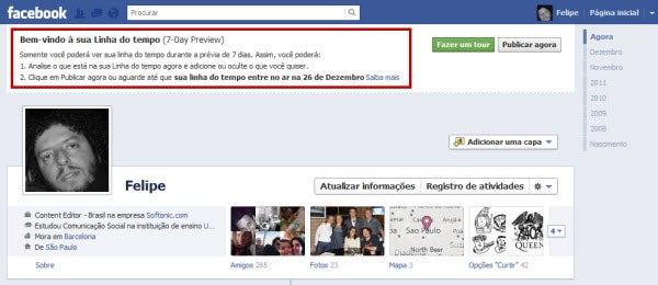 3. A próxima tela mostra o seu perfil já com a Linha do Tempo aplicada e com um aviso na parte superior.
