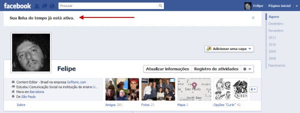 4. Se você tem certeza, senta o dedo no mouse e mude a sua página de perfil. Um novo aviso é exibido confirmando que a Linha do Tempo já está ativa: