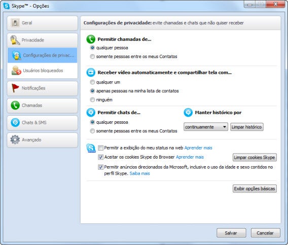 Para desabilitá-la no Skype, siga o caminho “Ferramentas » Opções » Privacidade » Exibir opções avançadas” e escolha a opção “sem histórico” na seção “Manter histórico por”. Para garantir que nenhum rastro ficou para trás, clique em “Limpar histórico” e em seguida em “Excluir”.