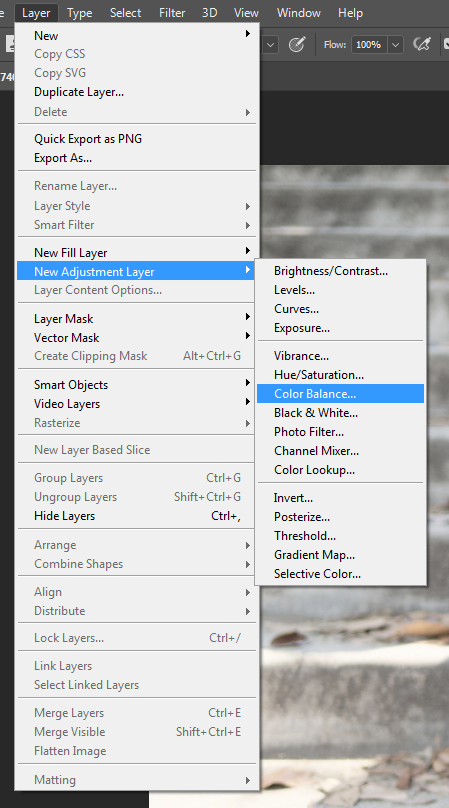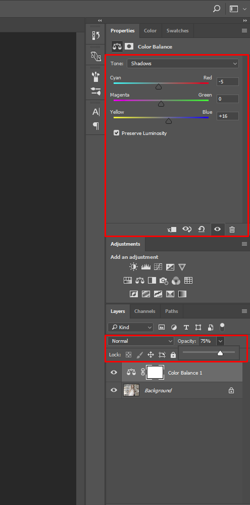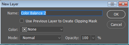 Indo para Imagem > Ajustes > Balanço de Cores irá permanentemente mudar as cores da imagem de fundo. Invés disso, você pode ir para Camadas > Novo Ajuste em Camada > Balanço de Cores, onde você será requisitado escolher um nome para a Camada de Ajuste. Agora você pode trabalhar nas cores de sua foto, sabendo que as mudanças poderão ser facilmente modificadas ou descartadas depois.