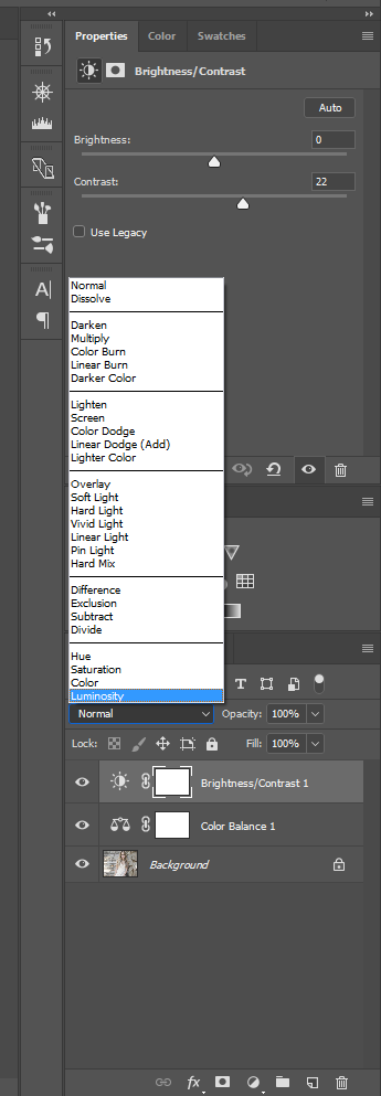 A melhor forma de fazer isso é criando um novo Ajuste de Camada (Camada > Novo Ajuste de Camada) tanto para Brilho/Contraste ou, se você estiver corajoso, Curvas. Como nós queremos que esse Ajuste de Camada altere somente a exposição da imagem – no lugar das cores ou outra coisa – nós iremos também mudar as configurações de Modo no painel do Ajuste de Camada de Normal para Luminosidade.