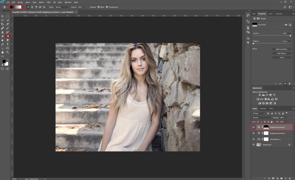 Se o efeito ainda está muito sútil – caso a parte inferior da imagem não está escura o suficiente – nós temos duas opção principais abertas. A solução mais fácil é mover o slider do Brilho mais para a esquerda no painel dos Ajustes, escurecendo a base da foto. Entretanto, o gradiente que ameniza a transição pode não lidar muito bem com isso, e o efeito ficará muito óbvio. Se isso ocorrer, a alternativa é manter nosso primeiro Ajuste de Camada como ele está e então repetir o processo acima, mas dessa vez fazendo que o gradiente inicie um pouco mais baixo ou acima da foto. Dessa forma ele irá se sobrepor, mas não exatamente, ao nosso primeiro ajuste de camada; provavelmente tornando a transição mais suave.