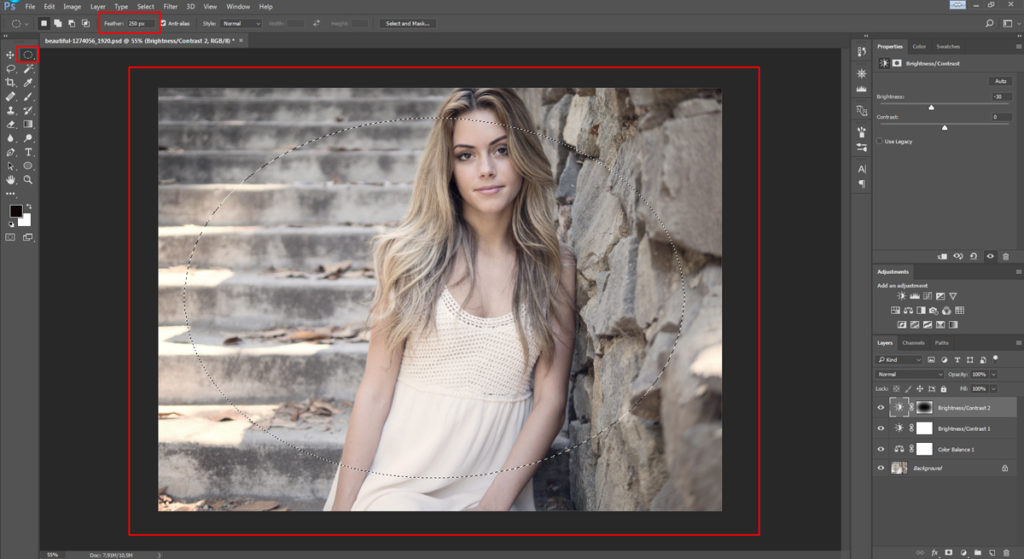 Outra técnica altamente eficaz na edição é usar vignete; que significa sutilmente escurecer os contornos e cantos de uma foto enquanto deixa o centro com sua exposição normal. Isso tem o efeito de desenhar o olho do expectador na foto e pode ser conseguido na exata forma que nós adicionamos peso na base da foto nos passos acima. Apenas que dessa vez nós iremos desenhar um círculo com o Laço ou com a ferramente de Elipse no centro da foto, para que então o Ajuste de Camada apenas altere os bordos e cantos da foto.
