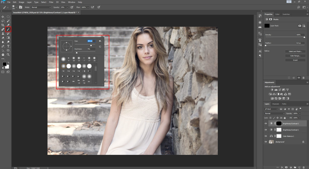 Vamos imaginar que nós queremos escurecer um elemento particular da foto. Existem diversos modos que nós podemos fazer isso, mas talvez o mais efetivo é criando um novo Ajuste em Camada e deslizar o controle do Brilho para a direita para escurecer a imagem, conforme fizemos acima.