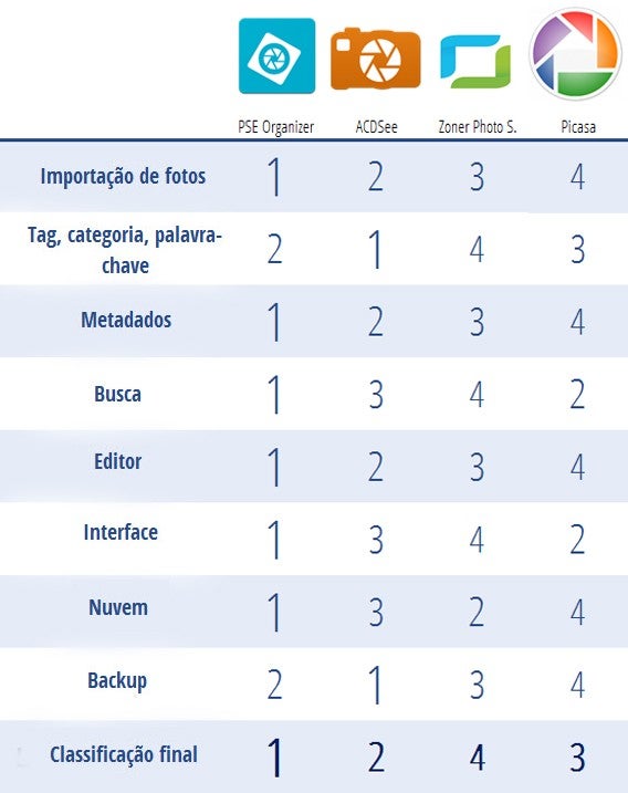 Depois de ter testado exaustivamente as oito funções básicas de ACDSee, PSE Organizer, Picasa e Zoner Photo Studio, e depois de terem sido postos à prova, com um banco de dados de quase 9.000 fotos, é hora de definir qual será o vencedor.