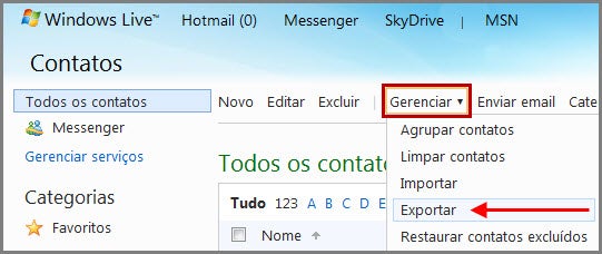 2. Automaticamente, a sua lista de contatos será exibida. Clique na aba “Gerenciar” e escolha a opção “Exportar”: