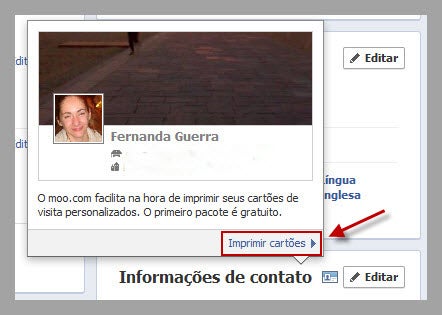Agora o melhor de tudo: imagine receber seus 50 cartões de visita grátis, impressos, com dados do seu perfil do Facebook. A rede social lançou essa campanha junto com o site Moo.com, especializado em impressão de cartões, sem alarde. O único custo é o de envio, que sai por menos de 10 reais e demora cerca de um mês (envio comum).
