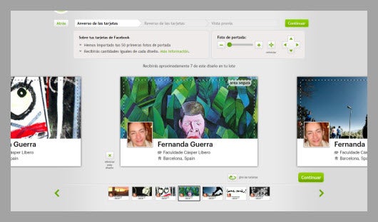 O Facebook adicionou um aplicativo à linha do tempo que reconhece os dados do perfil e os transforma em cartões de visita . O aplicativo importa as 50 primeiras fotos de capa da sua timeline e cria variações de cartões baseadas em cada uma delas, dividindo-as em quantidades iguais.