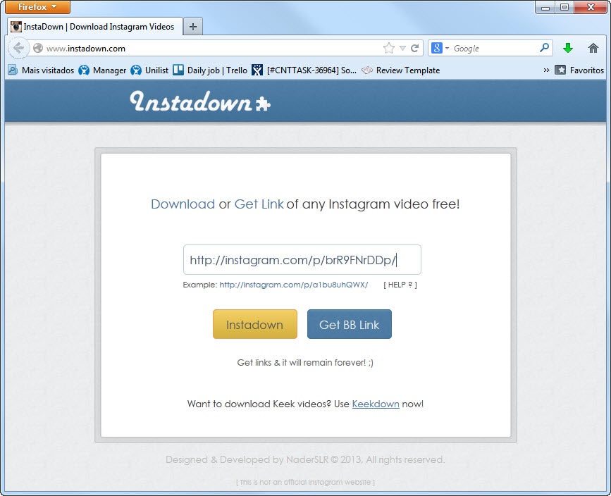 Em seguida, acesse o site www.instadown.com, cole o link no campo correspondente e clique no botão “Instadown”.