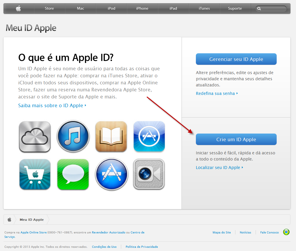 No seu navegador, entre na página da Apple. Para criar um Apple ID novo, aperte o botão “Crie um ID Apple”: