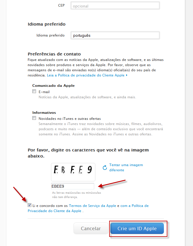 Não se esqueça de colocar as letras que aparecem na imagem Captcha e de marcar a casa dizendo que você leu os termos de serviço da Apple. Agora, com tudo preenchido, é só clicar no botão “Crie um ID Apple”.