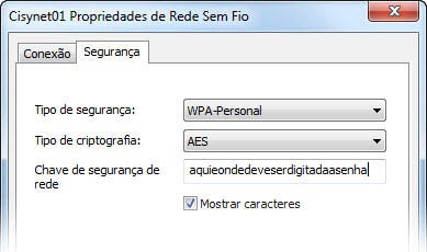 Na janela de propriedades abra a aba “Segurança”. Nesta tela você vê as informações da conexão, como o tipo de segurança e criptografia. Mas, mais importante, mostra a senha da rede Wi-Fi.