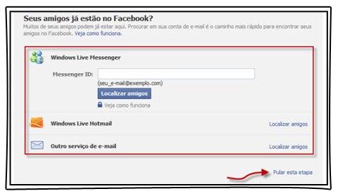 Nessa fase do processo, você pode escrever o e-mail do Messenger para localizar seus amigos atuais e avisá-los de que você acabou de chegar ao Facebook.