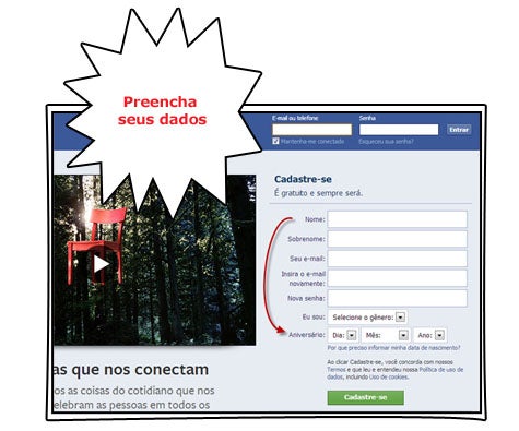Para usar o Facebook, você precisa se registrar na página, ou seja, informar alguns dados pessoais e definir seus dados de acesso (o que se costuma chamar de “login” – a palavra vem do inglês “to log in” e significa registrar, conectar).