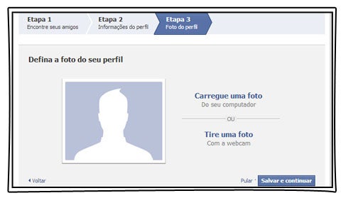 Publique uma foto sua para que seus amigos possam identificá-lo. Você pode tirar uma foto na hora, usando uma webcam, ou usar alguma imagem guardada no computador. Outra vez, clique em “Pular” se quiser fazer isso mais tarde.