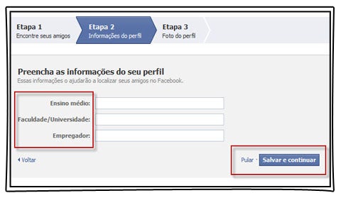 Por isso, neste ponto, o Facebook pede mais alguns dados a seu respeito: a escola onde você fez o ensino médio, sua faculdade/universidade, onde trabalha… Claro, esta etapa também é opcional na hora do registro, e você pode “pular” esta parte durante o cadastro.