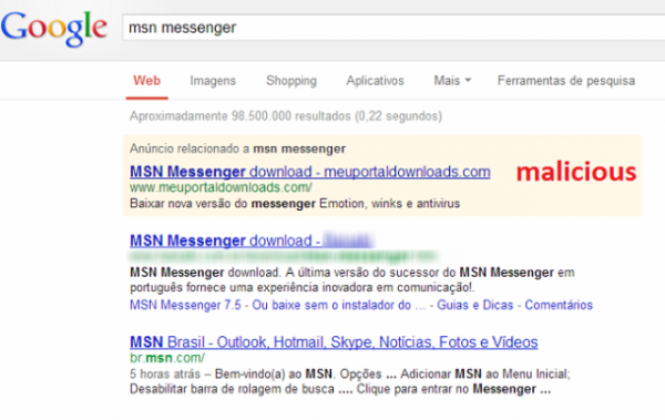 No caso do “meuportaldownloads.com”, o cibercriminoso comprou o domínio de internet, criou um falso portal de downloads e também comprou anúncios no Google, para fazê-lo aparecer na primeira posição da lista de resultados do buscador quando alguém faz uma pesquisa por “MSN”.
