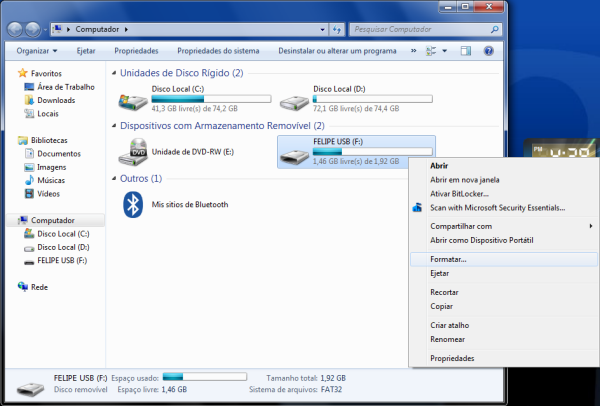1. Conecte o USB e vá a Meu Computador. Clique com o botão direito no ícone correspondente ao pendrive e selecione “Formatar”.