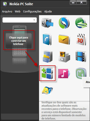 Na figura abaixo, você vê como é esta sequência no Nokia PC Suite: conecte o celular e, depois da sincronização, clique no ícone verde e azul, de “Instalar Aplicativos”.