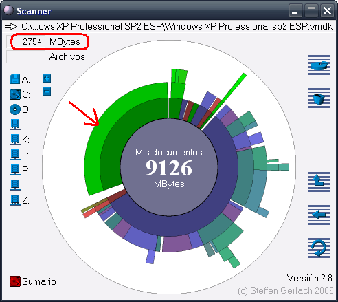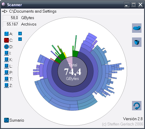 O Scanner apresenta um gráfico cheio de círculos de diferentes tamanhos. Cada um deles representa uma pasta. Quanto maior for o círculo, maior é o espaço que ela pasta ocupa. No centro estão os diretórios principais e ao redor deles, as pastas e programas que contém.
