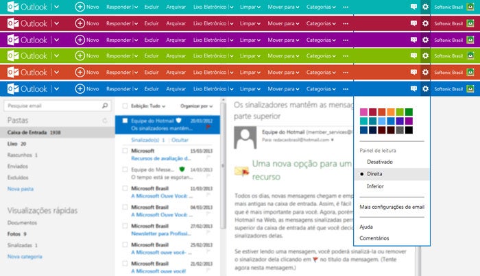O Outlook.com permite realizar ajustes e modificações para adaptar o programa às suas necessidades. Você escolhe o idioma, as cores da interface, decide onde ficarão os painéis, cria regras para classificar mensagens e muito mais.