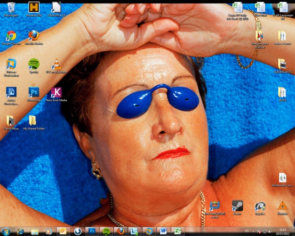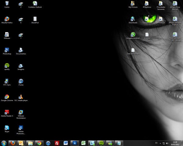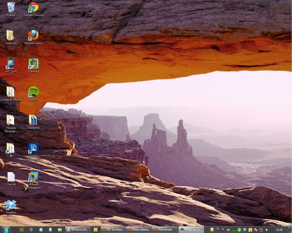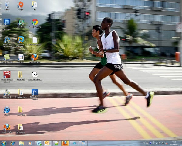 Um desktop comum de um típico usuário Windows, neste caso Windows 7. O wallpaper varia a cada semana, dia ou hora: o Corinthians ganhou o jogo? Gostei do filme que assisti no cinema? É desses eventos que tiro ideias para o fundo de tela.