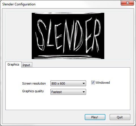 A primeira tela que você vê no Slender é a de configurações do jogo. É aí onde você define resolução de tela, qualidade dos gráficos e se você quer jogar em tela cheia ou não: