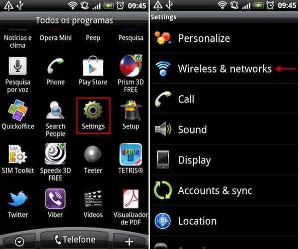 1. Em “Settings” (Configurações), selecione a opção “Wireless & Networks” (Sem fios e redes):