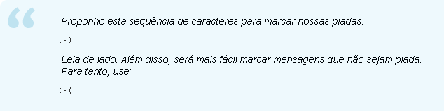 Na década de 80, juntamente com os primeiros passos da Internet e da informática em geral, não era incomum que alguém quisesse dizer “estou feliz” e se sentisse um pouco ridículo ao fazê-lo com palavras. Foi então que um senhor chamado Scott E. Fahlman propôs o uso de cadeias de texto semelhantes a rostos para mensagens escritas.