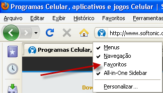 1 . Claro que você precisa ter o Firefox instalado. Por padrão, a barra de favoritos não vem ativada e para que ela apareça é muito fácil. Clique com o botão direito do mouse em qualquer área vazia da barra superior do Firefox e selecione “Favoritos”: