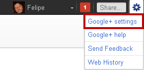 1. No canto superior direito do Google +, clique na engrenagem, tradicional símbolo de “ferramentas” e selecione “Google + settings”: