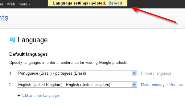 Selecione o português e, na parte superior da página, clique em “Reload” para que suas mudanças tenham efeito.