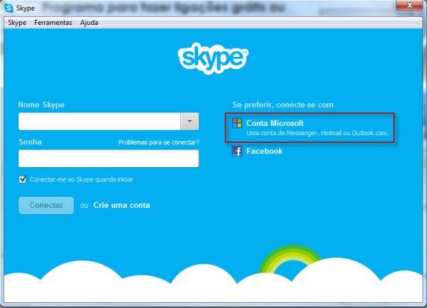 Ao abrir o Skype, a primeira tela que aparece é a tela de login. Nela, escolha a opção “Conta Microsoft” – pode ser uma conta do Messenger, Hotmail ou Outlook.com.