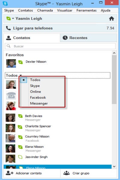Quem já usa o Skype e deseja ver somente os amigos do MSN pode clicar em “Todos” e selecionar “Messenger”. Assim, os contatos do Skype ficarão ocultos.