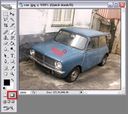 1. Para começar, abra a foto que quer transformar e selecione o modo Quick Mask no botão correspondente na Barra de Ferramentas – marcado em vermelho na imagem abaixo.