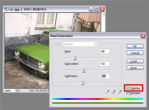 3. Aperte as teclas CTRL+U para abrir a ferramenta Hue/Saturation que serve para modificar as cores. Marque a opção Colorize e brinque deslizando as três barrinhas até conseguir a cor que você desejar.